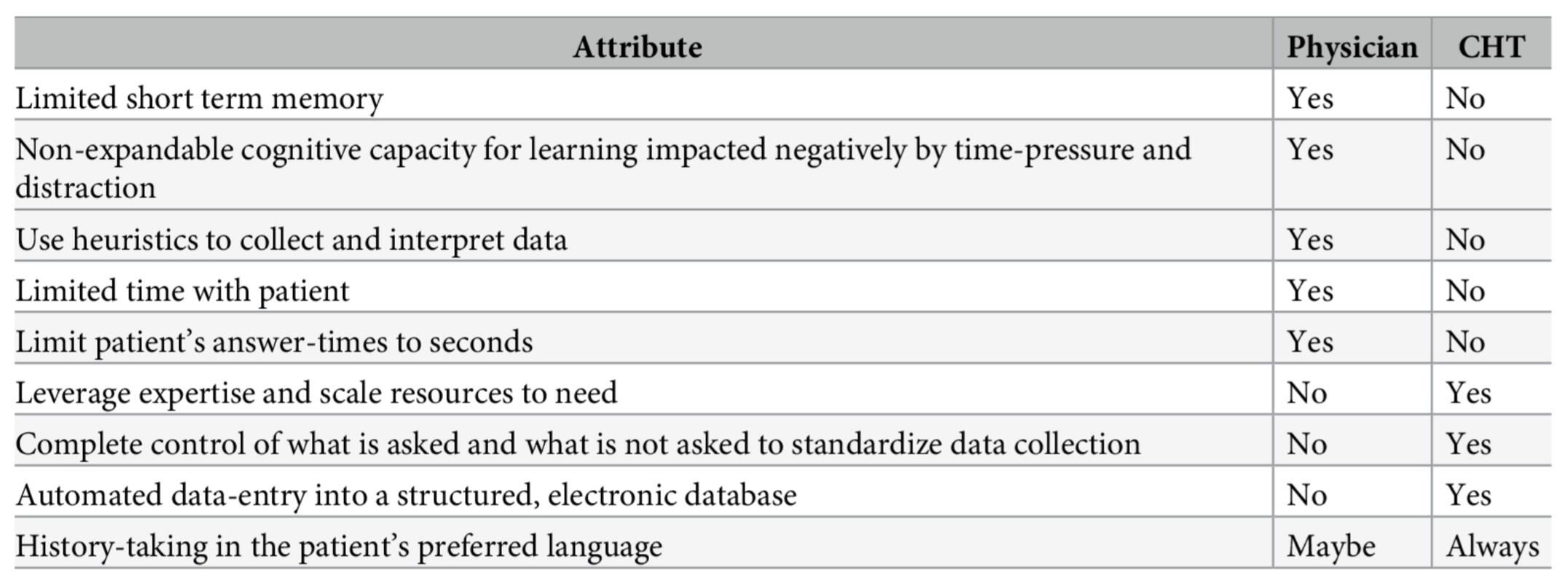 Comparison of physician and CHT attributes affecting the completeness, accuracy and bias of data collected by each method for history-taking.(https://doi.org/10.1371/journal.pone.0257677)